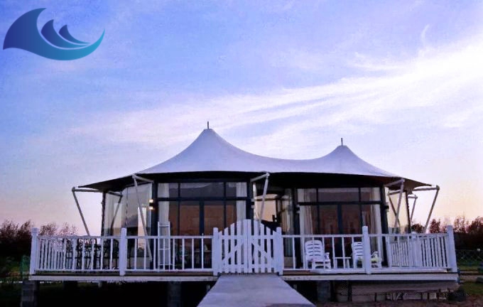 以獨特的頂尖篷帽,突出了帳篷酒店設計中的個性化,能自然與景色相融合,以高端的設計和采用優質的鋁合金材質、篷布與各種材料,搭建成的帳篷酒店、能抵得起8-10級臺風,抵抗沖擊力和避免受影響的破壞性。